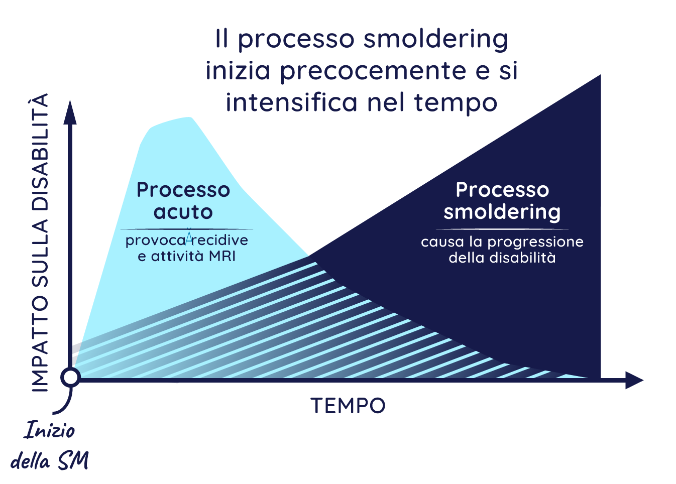 Il processo smoldering può causare gradualmente danni al cervello e al midollo spinale, con conseguente progressione della disabilità. Questo processo inizia prima che si manifestino i primi sintomi e provoca un lento accumulo di disabilità nel tempo.